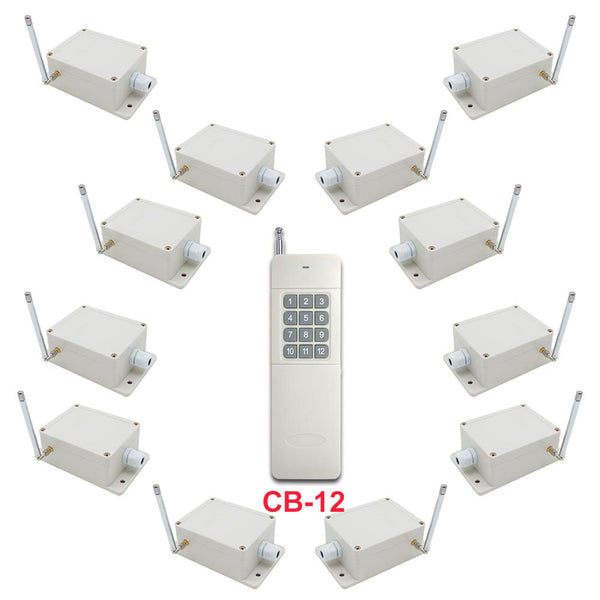 This is one-transmitter-many-receivers system with DC power output. It including twelve S1X-DC-ANT3 receivers and a CV-12 / CB-12 transmitter. It may be used in all types of industry automation, agriculture, business, home, factory, house, farm, garage, vehicle, ship, aerial vehicle, etc. It can remote control different DC equipment on land, water, and air, such as lights, doors, windows, lamps, sockets, locks, sirens, outlets, heaters, motors, fans, electric solenoid valves, and security alarm systems. The applications are endless.