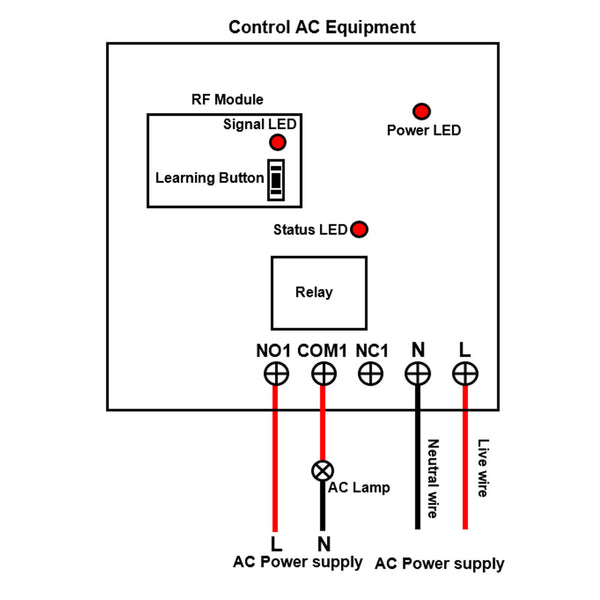 2.2 Connect terminal <NO> to the live wire of AC power supply, connect terminal <COM> to one side of AC lamp, and connect another side of AC lamp to the neutral wire of AC power supply.