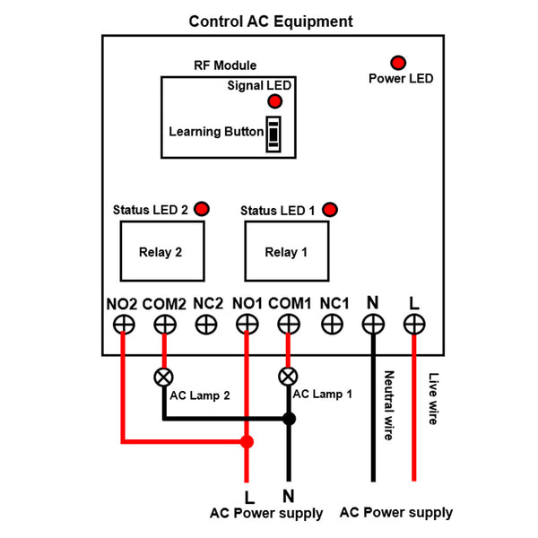 2.2 Connect terminal <NO> to the live wire of AC power supply, connect terminal <COM> to one side of AC lamp, and connect another side of AC lamp to the neutral wire of AC power supply.