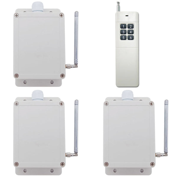 This is one-transmitter-many-receivers system with relay output. It including three S2U-AC-ANT3 receivers and a CV-6 transmitter. It may be used in all types of industry automation, agriculture, business, home, factory, house, farm, garage, vehicle, ship, aerial vehicle, etc. It can remote control different DC or AC equipment on land, water, and air, such as lights, doors, windows, lamps, sockets, locks, sirens, outlets, heaters, motors, fans, winches, curtains, blinds, linear actuators, electric solenoid valves, and security alarm systems. The applications are endless.