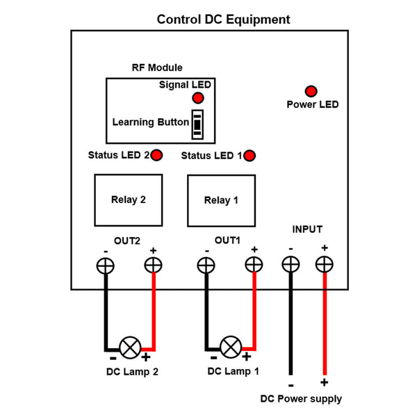 Hold button 1 → The terminal OUT1 of receiver 1 outputs DC power (lamp 1 ON)