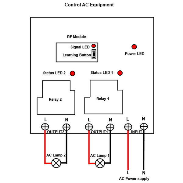 This receiver is an electric device with 2 channels AC power outputs that can be used in one-transmitter-many-receivers system. For example, you can use a 2 buttons transmitter to control 1 receiver, or use a 4 buttons transmitter to control 2 receivers, or use a 6 buttons transmitter to control 3 receivers, or use an 8 buttons transmitter to control 4 receivers, or use a 12 buttons transmitter to control 6 receivers, etc. The transmitter and receiver form a wireless remote-control system. This system may be used in all types of industry automation, agriculture, business, home, factory, house, farm, garage, vehicle, ship, aerial vehicle, etc. It can remote control different AC equipment on land, water, and air, such as lights, doors, windows, lamps, sockets, locks, sirens, outlets, heaters, motors, fans, winches, curtains, blinds, linear actuators, electric solenoid valves, and security alarm systems. The applications are endless.