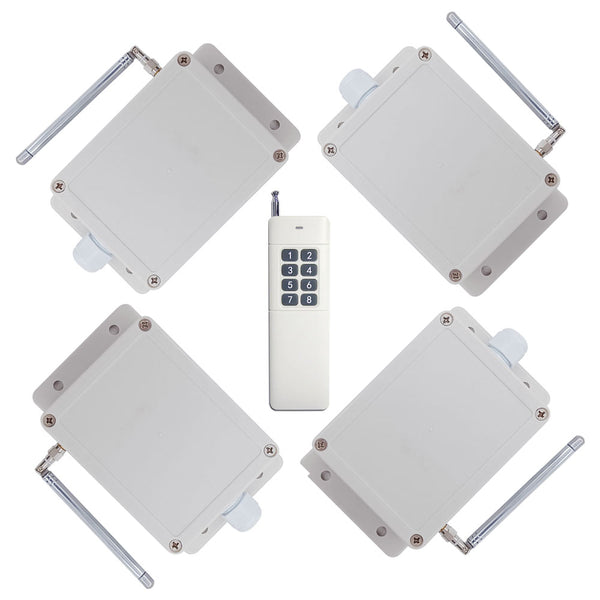 This is one-transmitter-many-receivers system with AC power output. It including four S2X-AC-ANT3 receivers and a CV-8 transmitter. It may be used in all types of industry automation, agriculture, business, home, factory, house, farm, garage, vehicle, ship, aerial vehicle, etc. It can remote control different AC equipment on land, water, and air, such as lights, doors, windows, lamps, sockets, locks, sirens, outlets, heaters, motors, fans, winches, curtains, blinds, linear actuators, electric solenoid valves, and security alarm systems. The applications are endless.