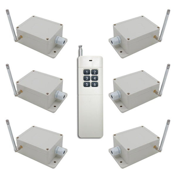 This is one-transmitter-many-receivers system with relay output. It including six S1U-AC-ANT3 receivers and a CV-6 transmitter. It may be used in all types of industry automation, agriculture, business, home, factory, house, farm, garage, vehicle, ship, aerial vehicle, etc. It can remote control different DC or AC equipment on land, water, and air, such as lights, doors, windows, lamps, sockets, locks, sirens, outlets, heaters, motors, fans, electric solenoid valves, and security alarm systems. The applications are endless.