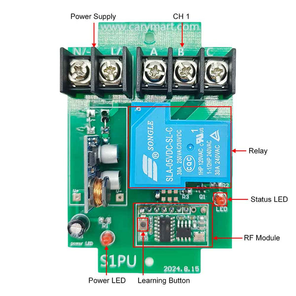 Relay Output: This receiver is dry relay output; it can be used to operate both DC and AC equipment. The output terminals are NO / NC (normally open / normally closed), serving as a switch. That means you should also connect a separate power supply to equipment.