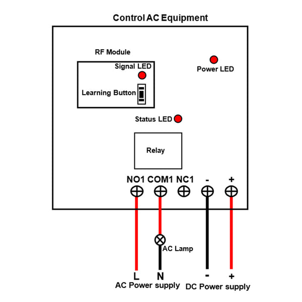 Relay Output: This receiver is dry relay output; it can be used to operate both DC and AC equipment. The output terminals are NO / NC (normally open / normally closed), serving as a switch. That means you should also connect a separate power supply to equipment.