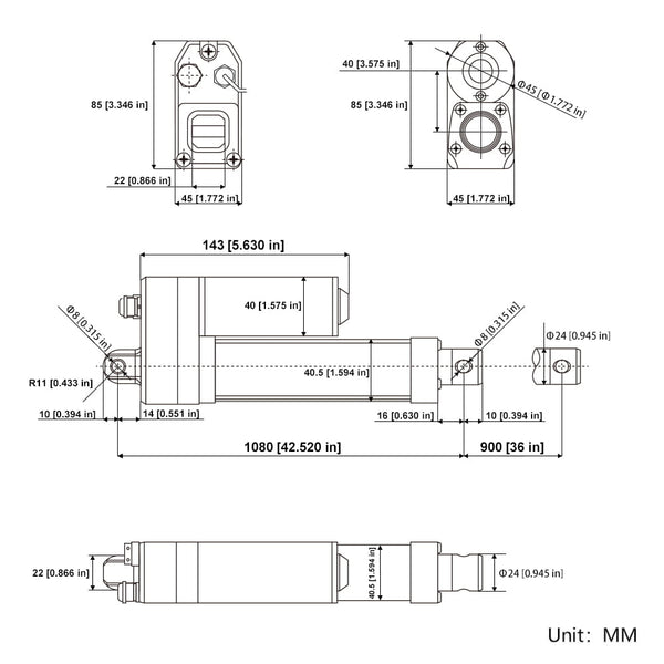 Rretraction Length: When the linear actuator is fully retracted, the center distance between the two mounting holes is 1080MM.